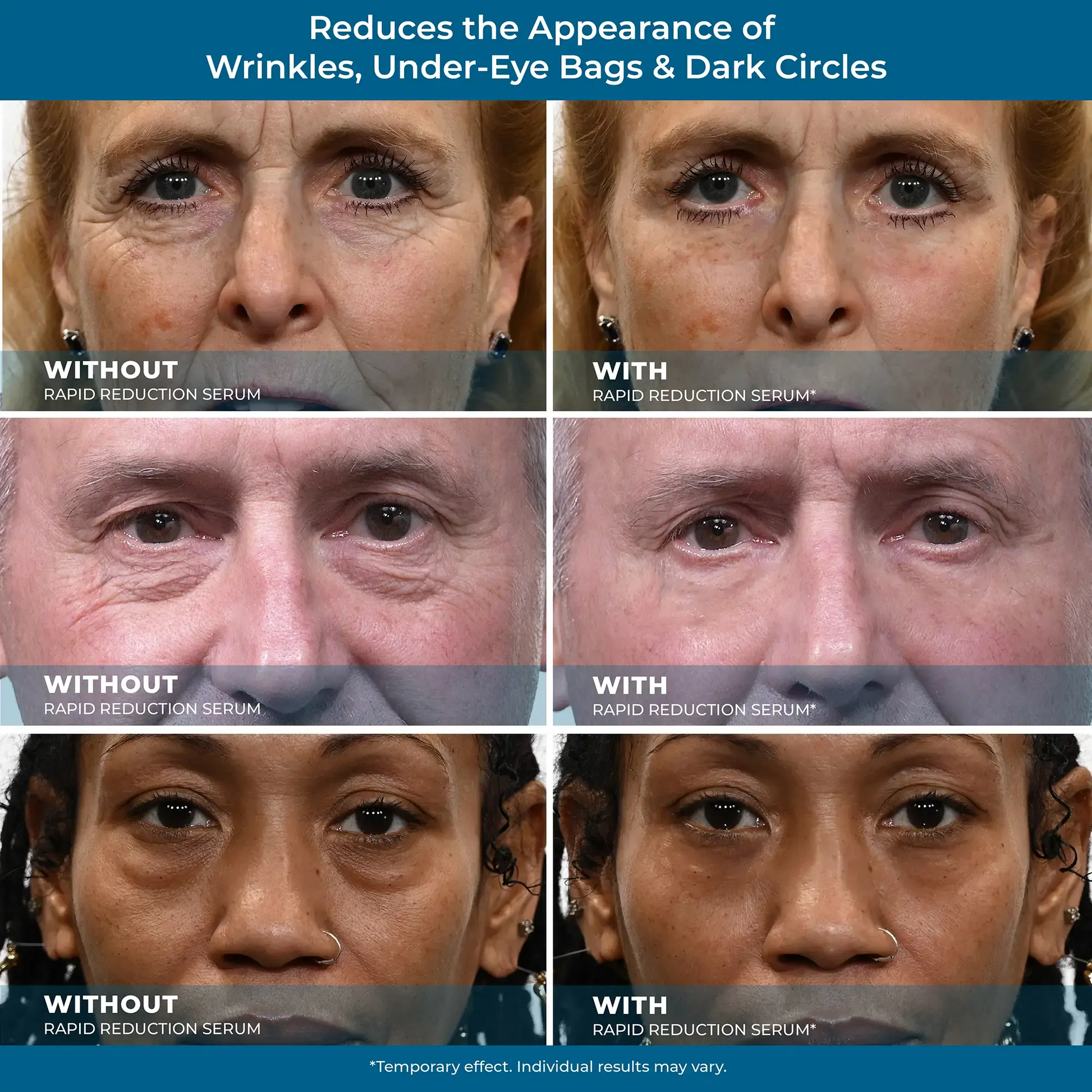 Our advanced Rapid Reduction Serum®formula uses silicate technology to create an invisible skin-perfecting layer on the surface of the skin. This revolutionary ingredient derived from shale clay works in minutes to reduce the visible signs of aging such as wrinkles, bags under the eyes, crow's feet, and dark circles. Even more, Rapid Reduction Serum®contains the potent anti-aging ingredient Acetyl Hexapeptide-8 to promote visibly smoother, more youthful-looking skin with regular use.